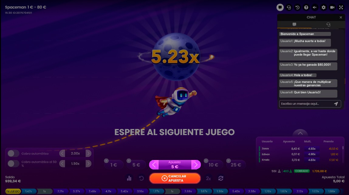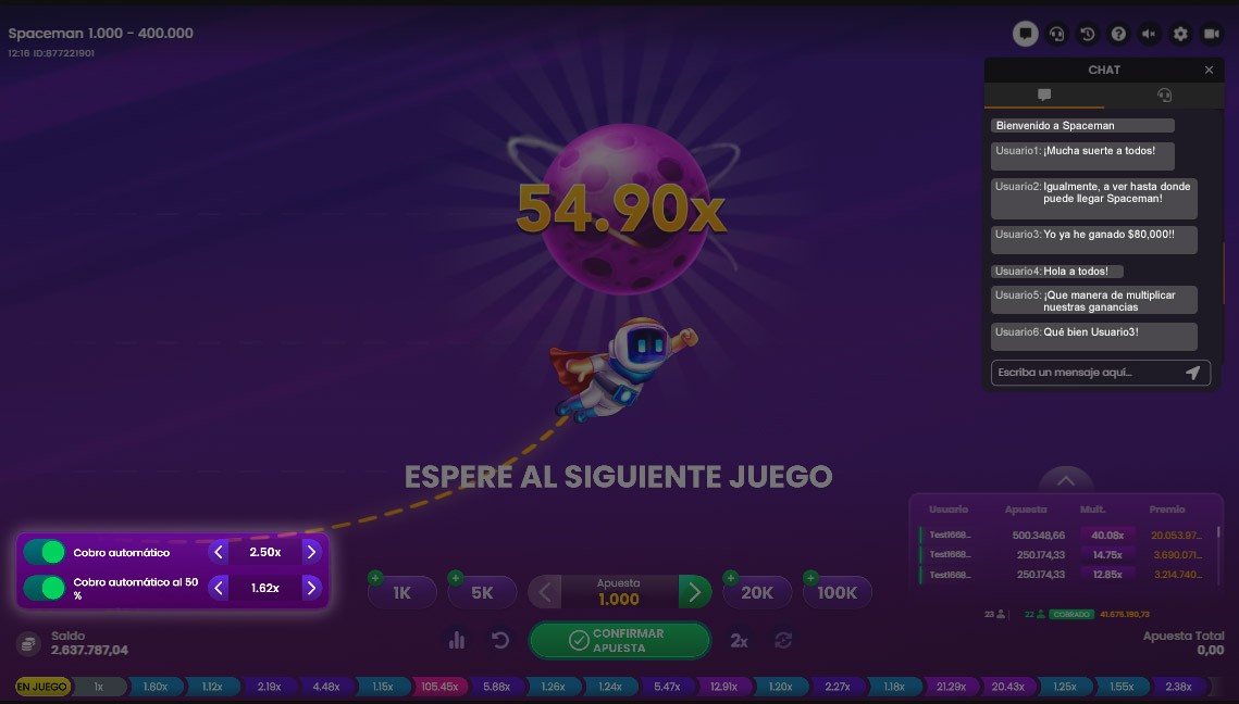 En Spaceman se hace una apuesta al inicio de la ronda. En las siguientes, puedes elegir una nueva apuesta, repetir la anterior, doblarla o establecer el juego automático.