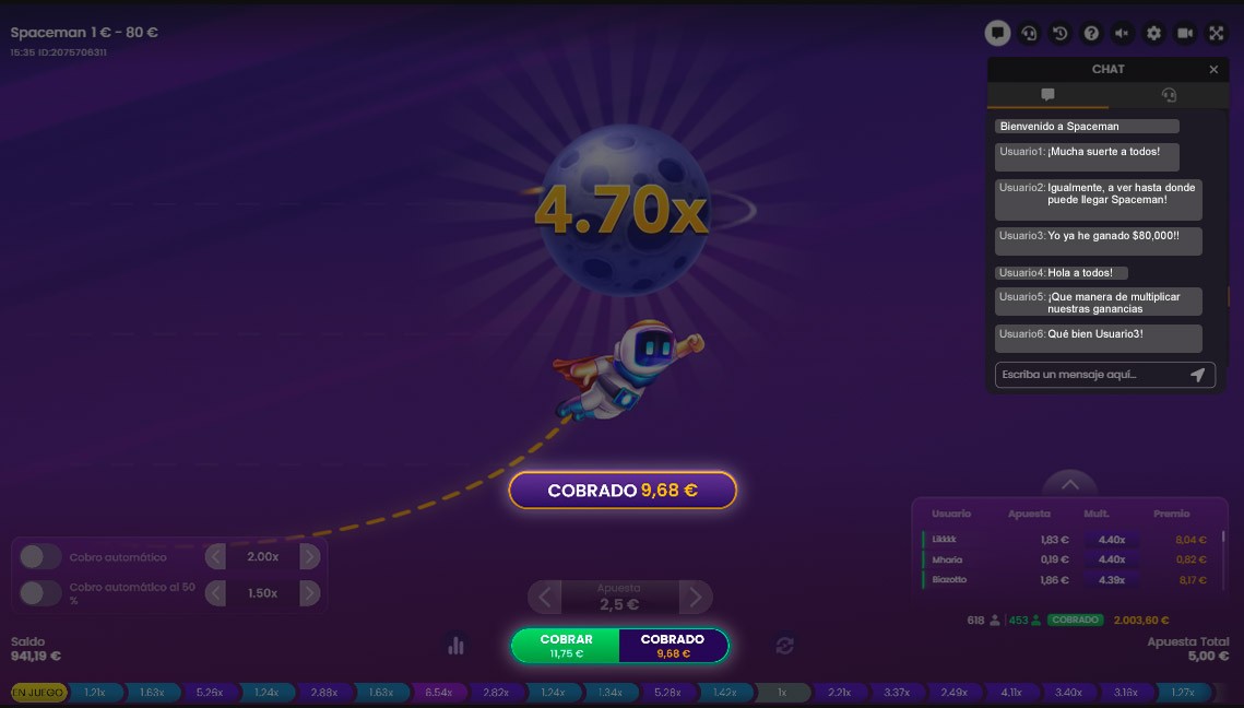 El astronauta empieza a 1,00x y va subiendo a la vez que aumenta el multiplicador. Por tanto, cuanto más largo sea el vuelo del astronauta, mayor será el multiplicador.